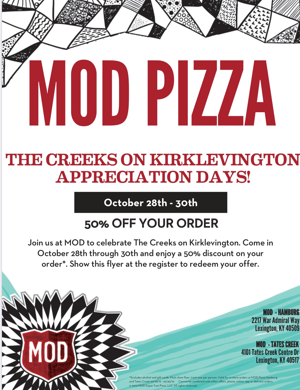 The Creeks On Kirk On Twitter Come By The Office And Grab A Flyer For Resident Appreciation Take One Of Our Flyers To Either Mod Pizza Location And Receive 50 Off Your